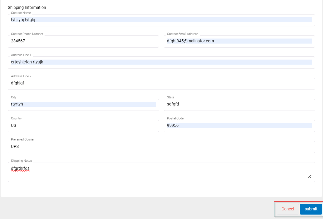 - The Contact Email, Contact Phone Number, Contact Email Address, Address Line 1, Address Line 2, City, State, and Postal Code will auto populate based on the State and Test center selected in step 1. Add Shipping Notes, if any.
