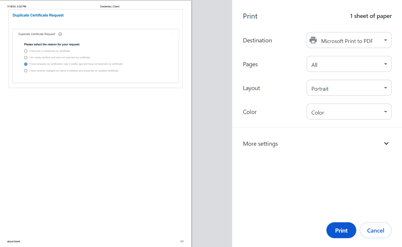 Note: The application displays the Print page. - Click Print to print a hard copy of the application.