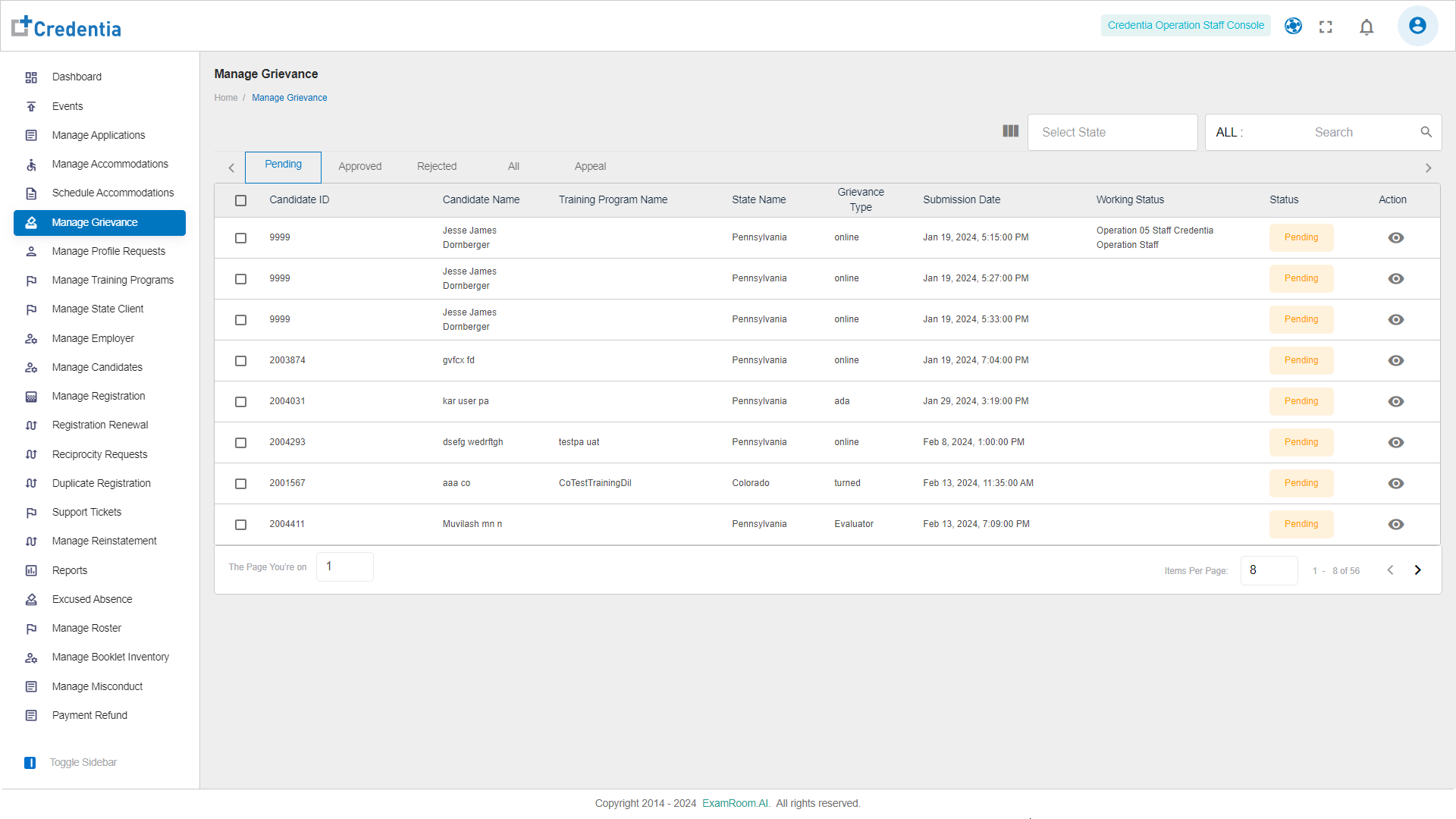 - View the Grievance application of the candidate.