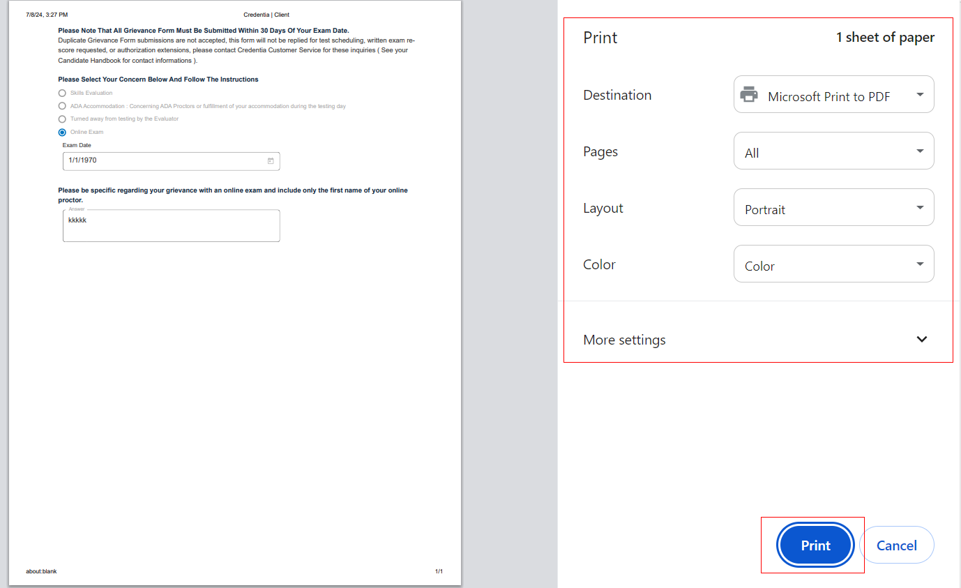 Note: The application displays the Print page. - Click Print to print a hard copy of the application.