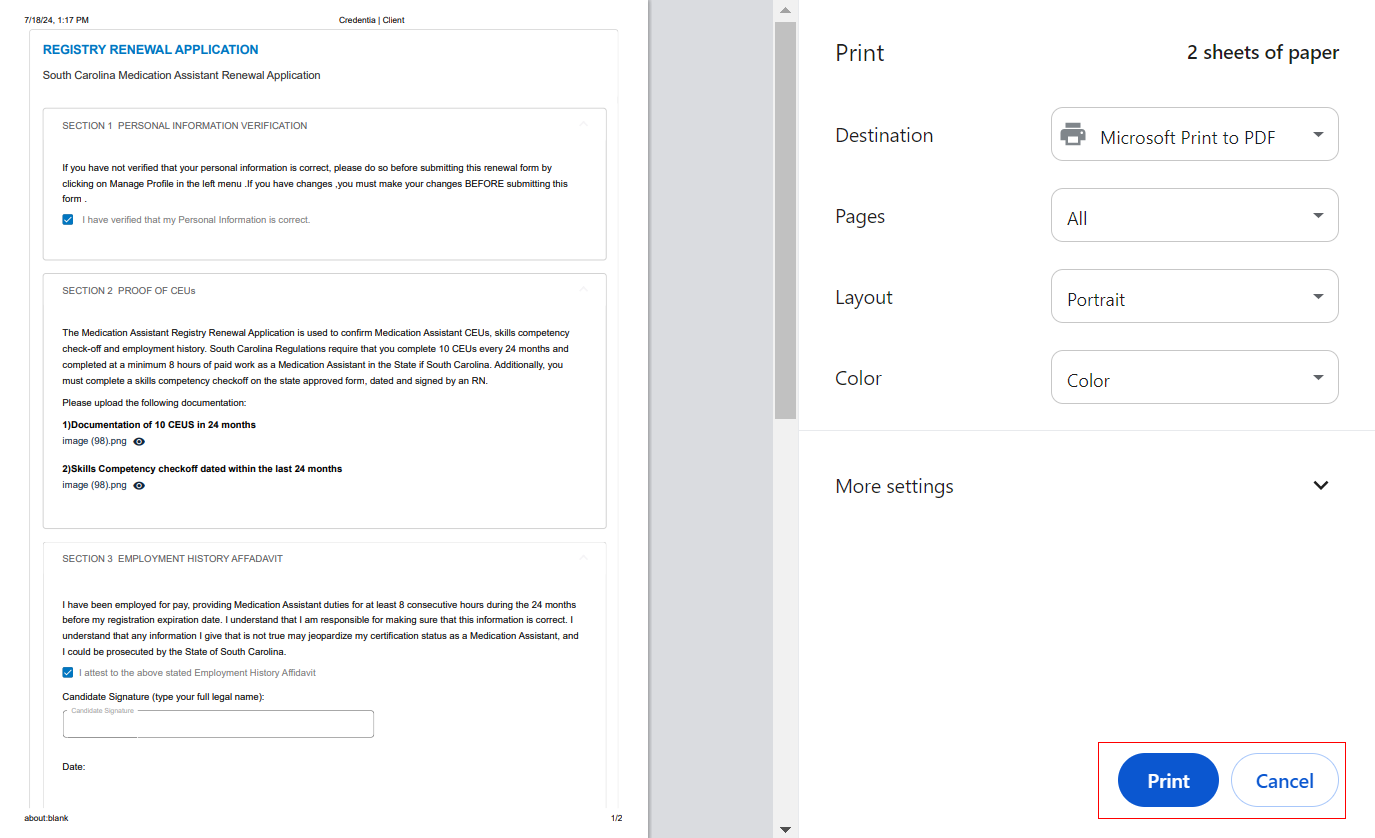 Note: The application displays the Print page. - Click Print to print a hard copy of the application.