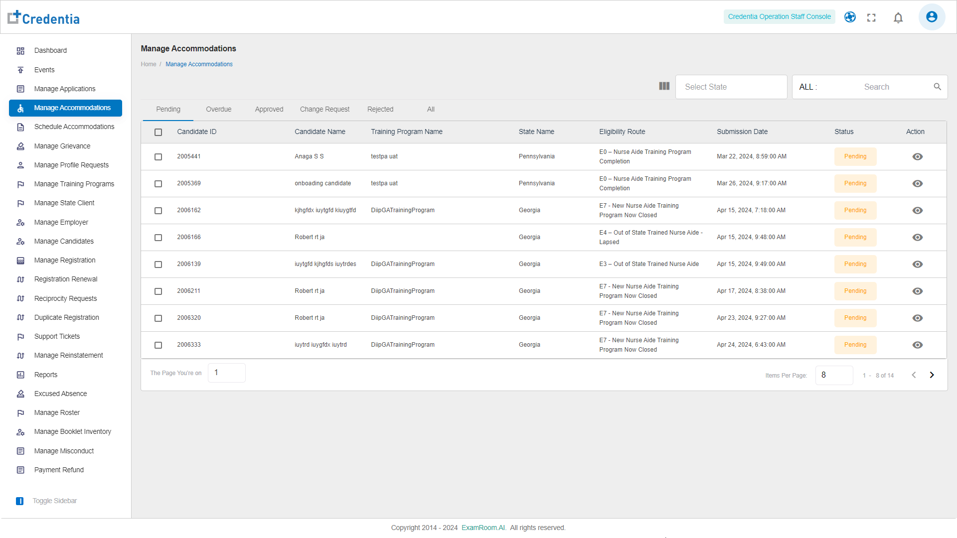 Candidates requesting exam accommodation must submit an accommodation request form. In the Manage Accommodations page, all the requests submitted by candidates are listed for the accommodation review process.