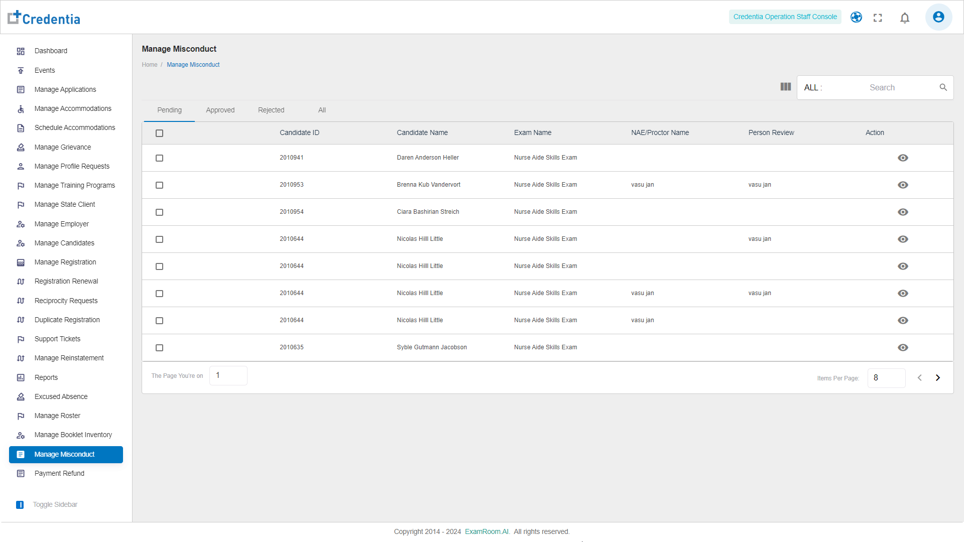 During the exam, if a candidate is flagged for any misconduct by the NAE/Proctor they raise the misconduct application, you have the option to review the misconduct reason and either approve or reject the application.