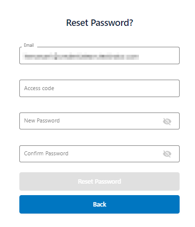 - Enter Access Code, a six-digit numeric code that is sent to your registered email address. Enter the New Password and Confirm Password.