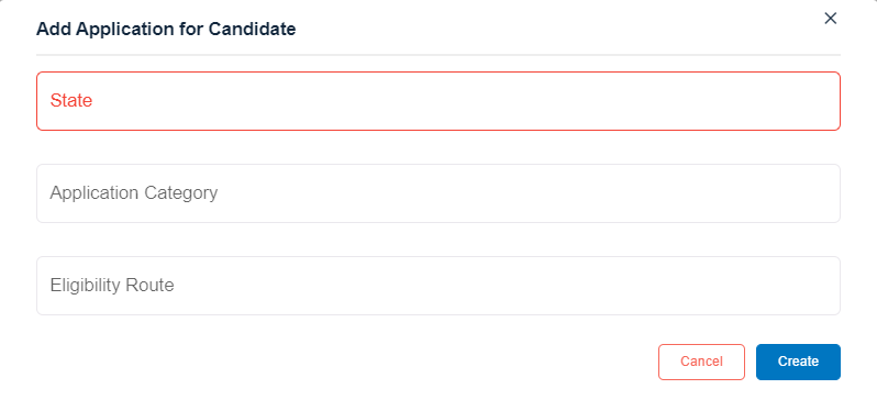Note: The application displays Add Application for Candidate Popup. - Select State, Application Category and Eligibility Route from the dropdown.