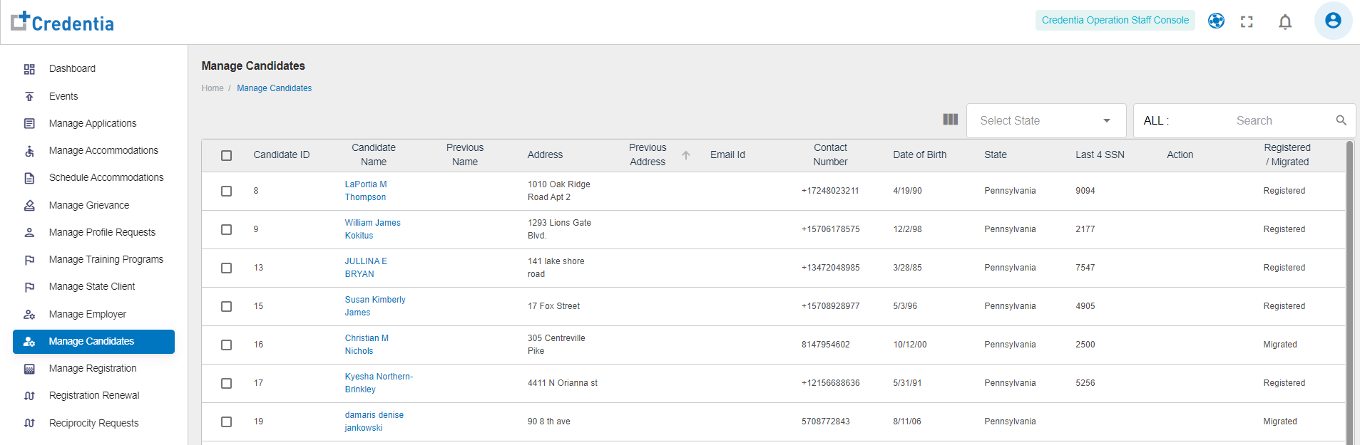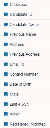 - Filter the list either by selecting the State or by entering the Candidate ID, Candidate Name, Previous Name, Address, Previous Address, Email Id, Contact Number, Date of Birth, and Last 4 SSN.