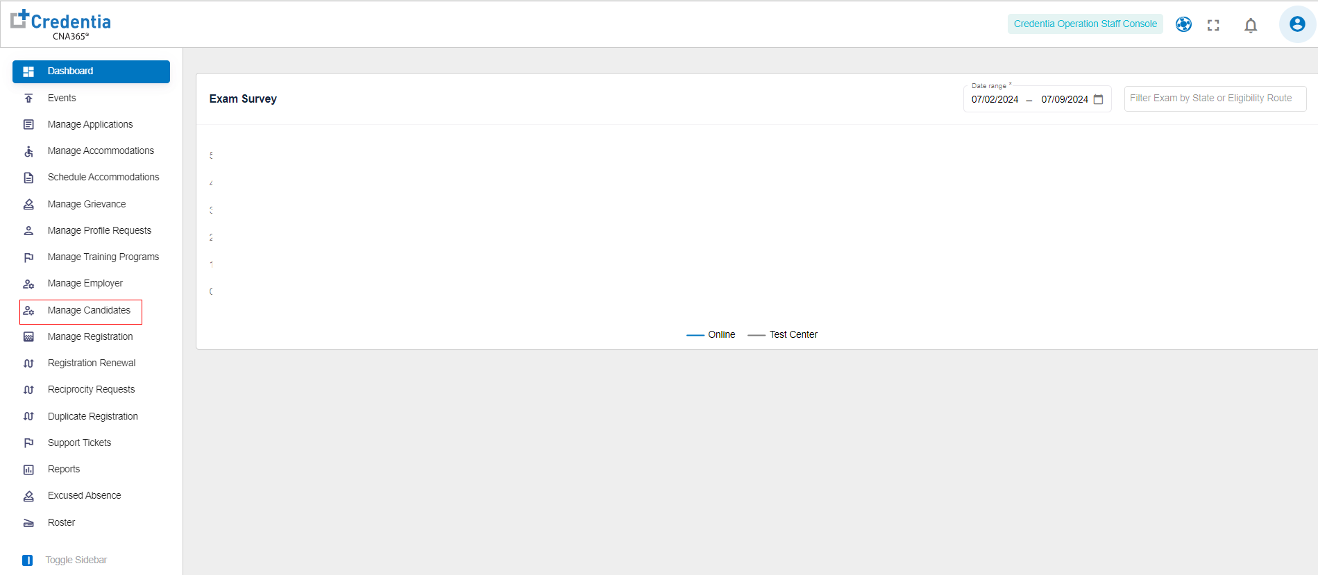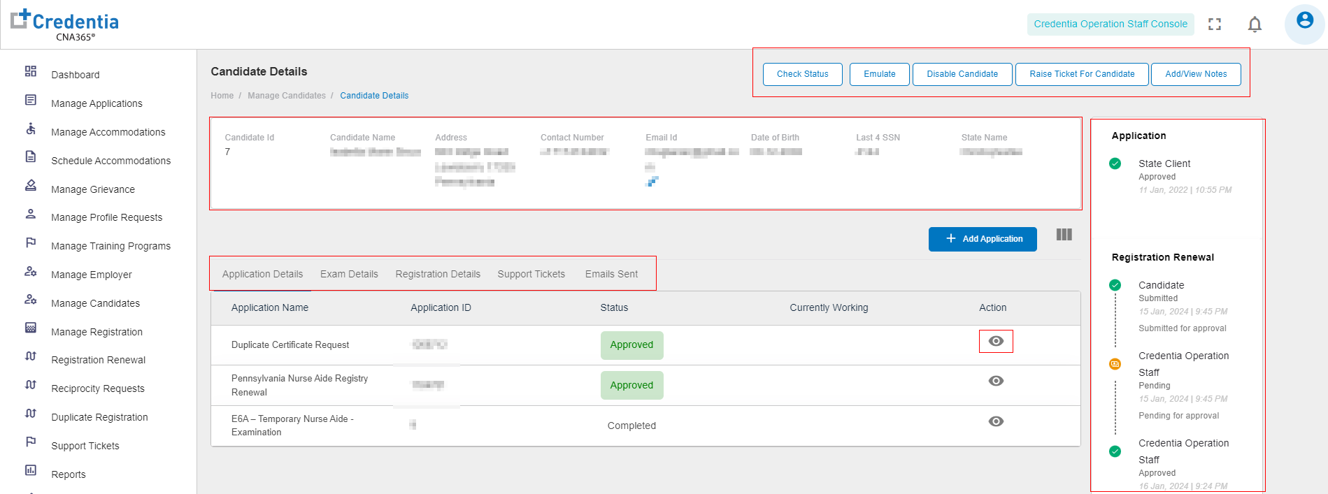 Operation Staff can view all candidate details across all states. Additionally, exams can be scheduled on behalf of candidates.