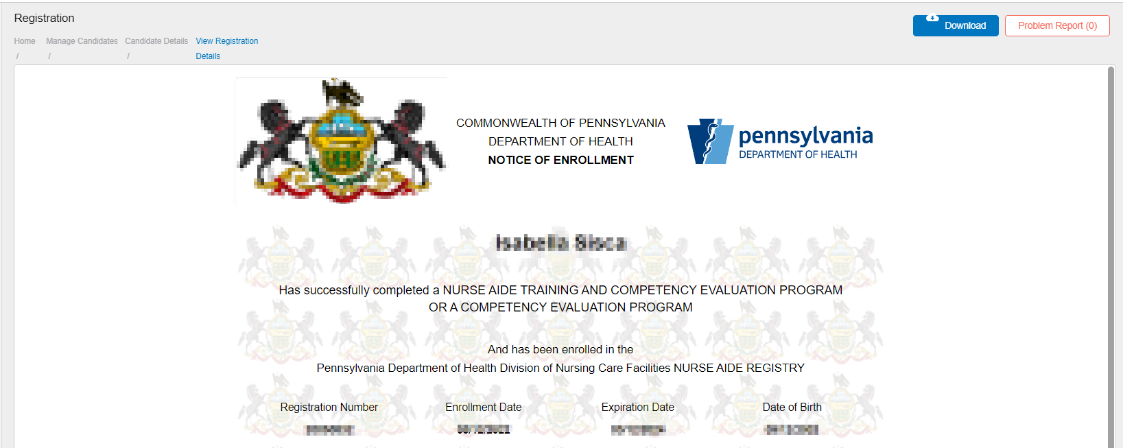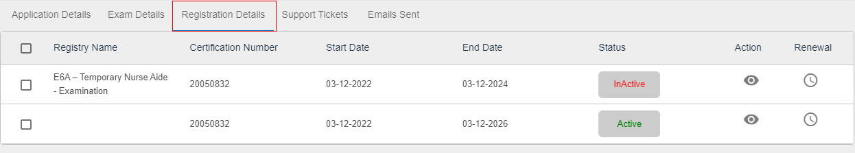 - Registered/Migrated – Shows the status of the candidate, whether registered or migrated.