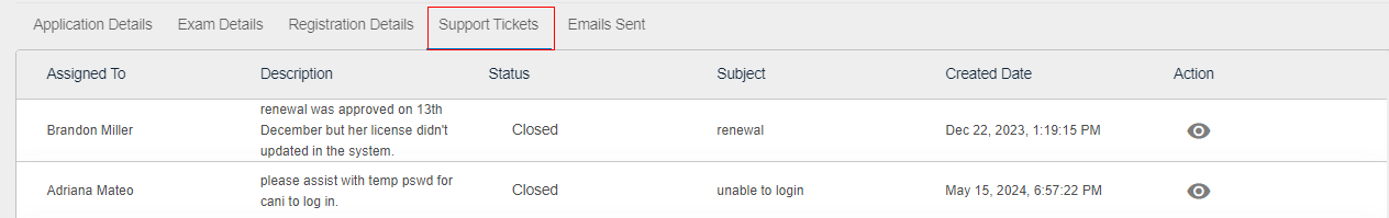 View icon to view the Support Ticket Details.