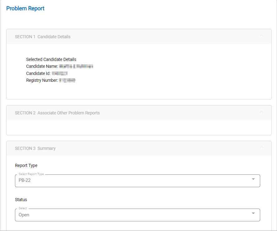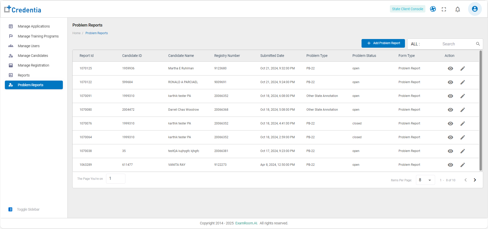 Note: Only Pennsylvania has access to this feature. - Filter the list by entering the Report ID, Candidate ID, Candidate Name, Registry Number, Problem status, and Form type.
