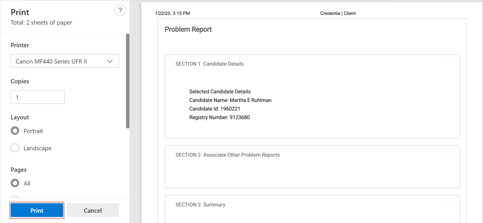 Note: After reviewing all the information, you may either download the report or skip it. - To download the report in PDF format, click Print.