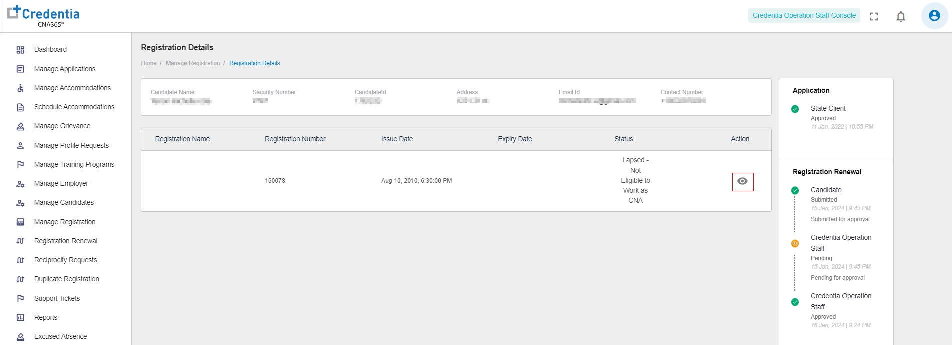 Operation Staff can view all candidate registration details, including certificate statuses.