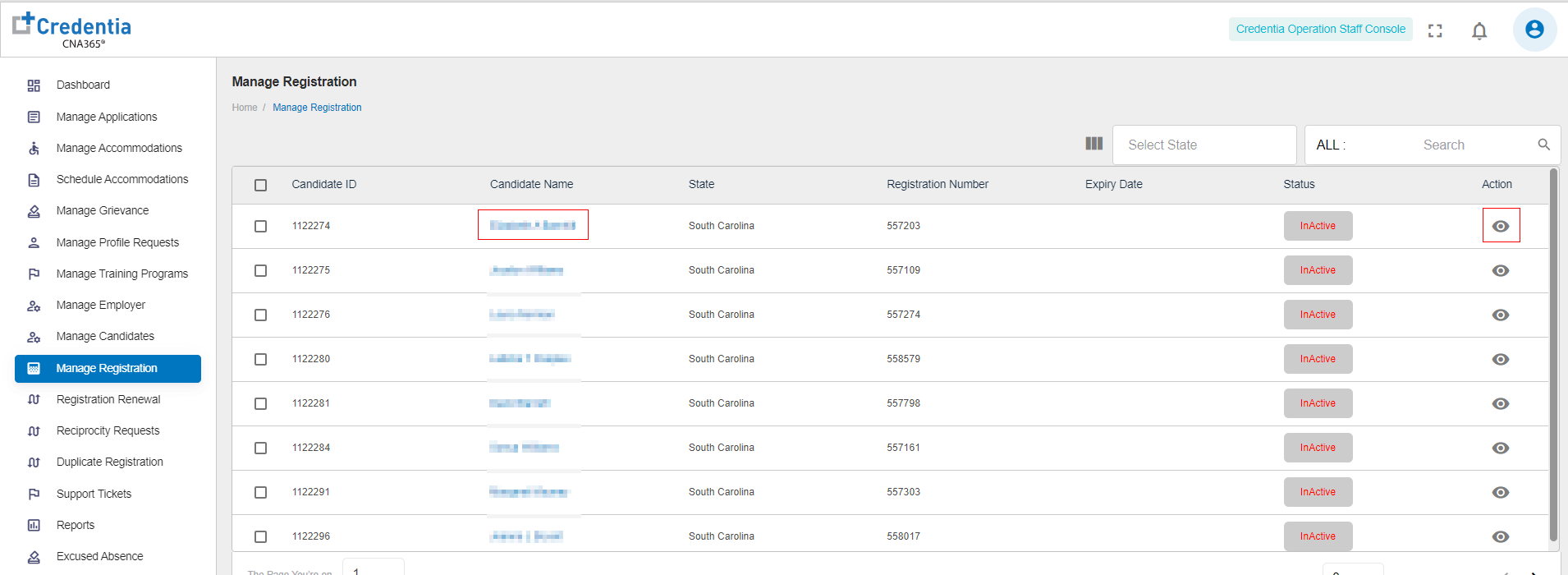 - Filter the list either by selecting the State or by entering the Candidate Name, Candidate Code, Registration Details, and Expiry Date.