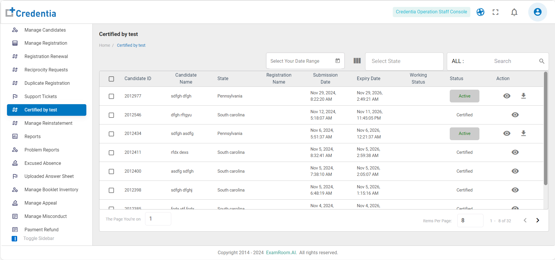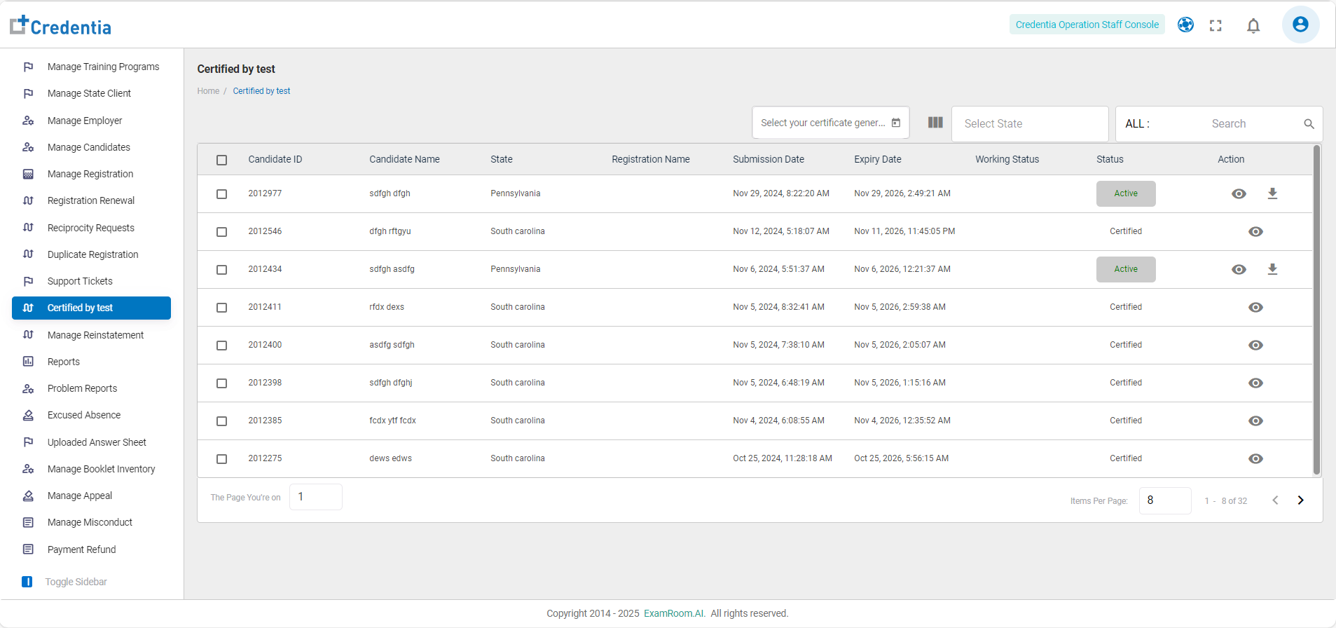 - Status – Shows the current status of the candidate’s certification.