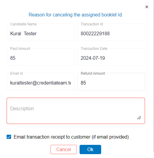 - Enter the reason in the Description box and check the Email Transaction Receipt to Customer checkbox.