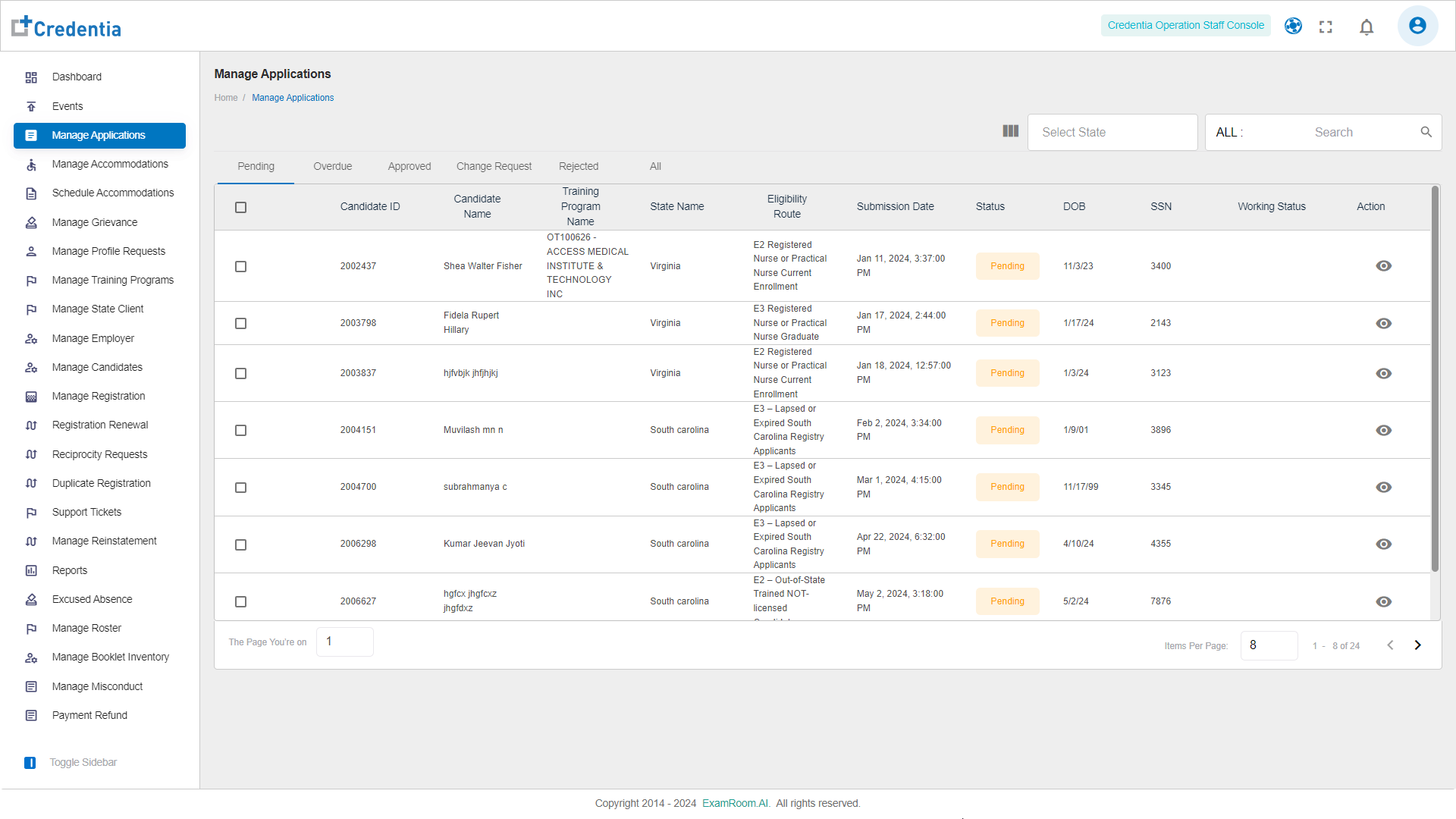 - View the Testing Application based on the Eligibility Route selected by the Candidate.
