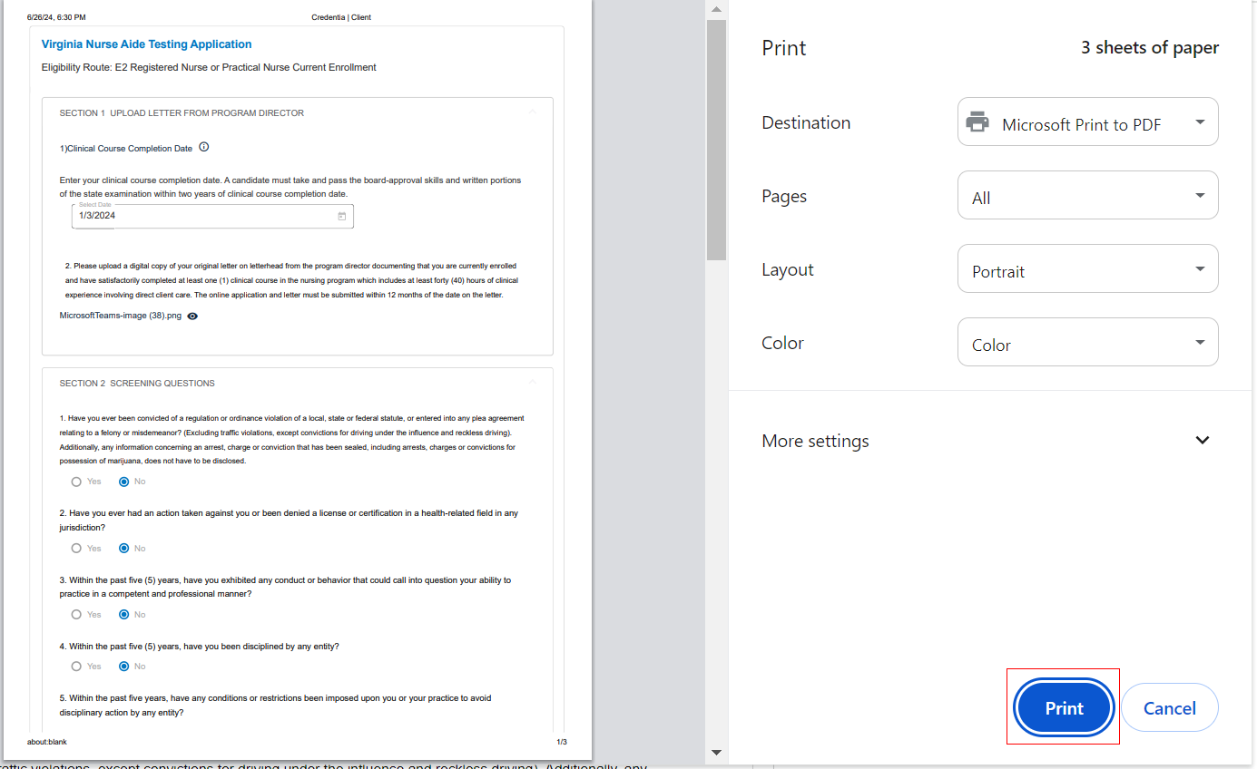 Note: The application displays the Print page. - Click Print to print a hard copy of the application.